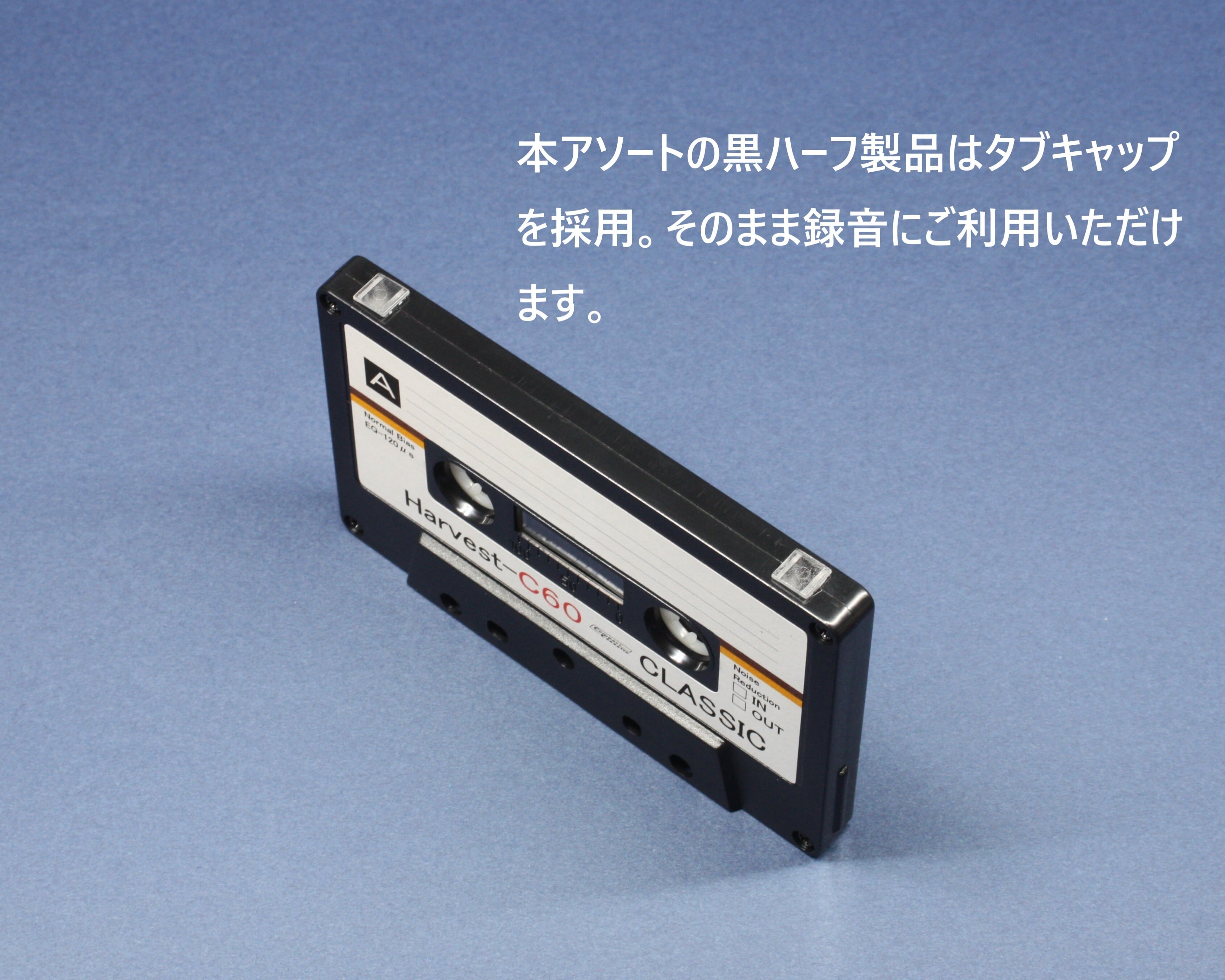 ・これら3製品はTab-Out型(ツメなし)ハーフ製品のため、民生用レコーダーで録音できるよう、タブキャップを装着してご提供いたします。そのまま、従来のTab-In型(ツメあり)カセットテープと同様にご利用ください。
